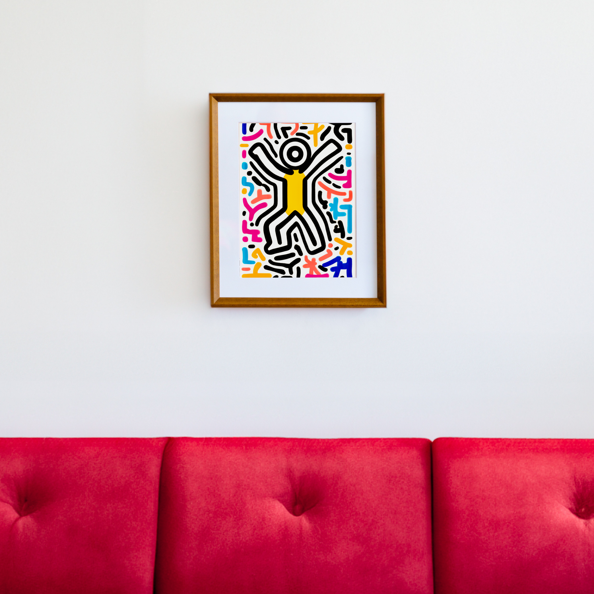 Signal Dance explodes with joyful chaos — a radiant figure caught in motion, surrounded by symbols that pulse like sound waves. With thick black lines and bursts of neon spray, the artist fuses digital iconography with street energy in a piece that feels both ancient and electric. A celebration of presence, movement, and pure visual rhythm.